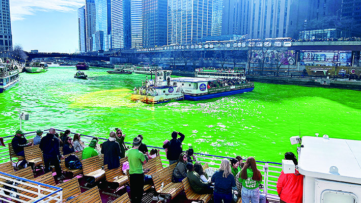 3月16日,人们在美国芝加哥市乘船游览为庆祝圣帕特里克节而被染成绿色的芝加哥河。新华社