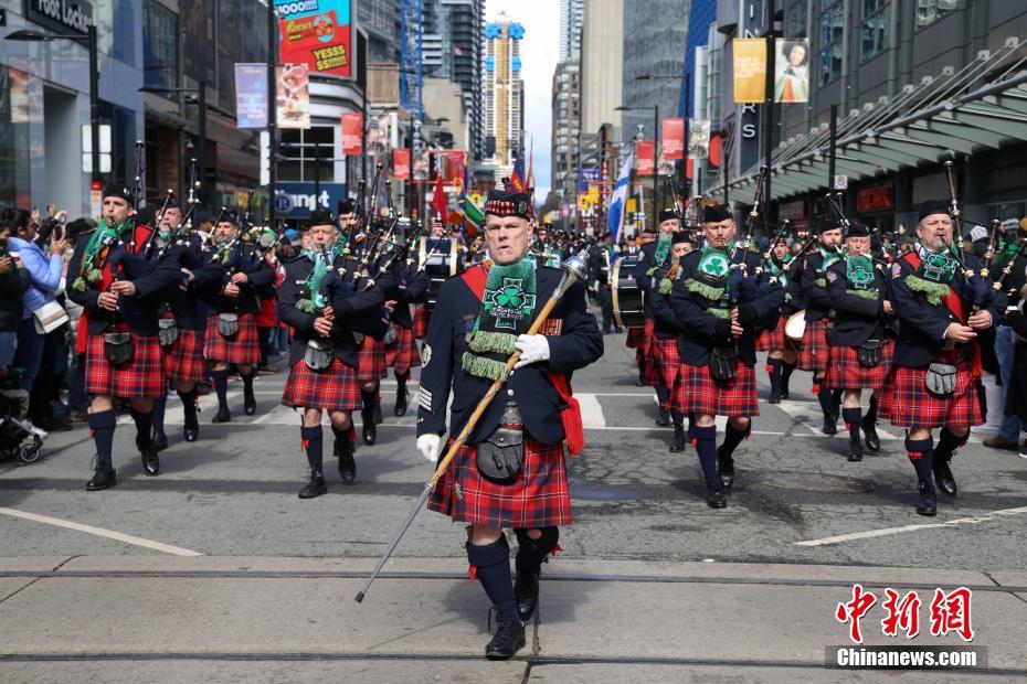 圣帕特里克节(3月17日)是爱尔兰传统的宗教和文化节日,后来成为爱尔兰国庆日。如今许多国家都庆祝圣帕特里克节,尤其是在爱尔兰移民较多的加拿大和美国。当地时间3月17日,加拿大多伦多举行圣帕特里克节大游行表演,当地爱尔兰裔、其他多个族裔社区和市政部门等方阵参加了此次盛大的年度节庆游行活动。图为身着传统服装的风笛队在大游行中表演。中新网