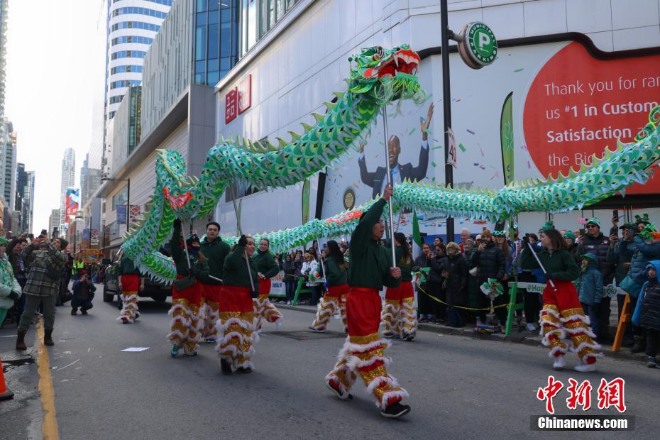 当地时间3月17日,加拿大多伦多,一支中式舞龙队在市中心举行的庆祝爱尔兰民族传统节日圣帕特里克节大游行中进行表演。中新网