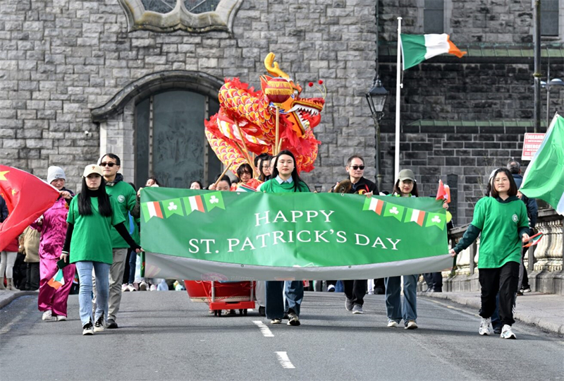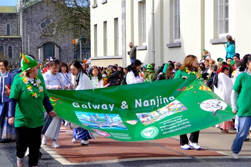 3月17日,在爱尔兰一年一度的圣帕特里克节上,来自爱尔兰各地孔子学院的师生以富有中国特色的文化展示吸引了当地民众的关注和赞誉。图为高威大学孔子学院组建方队加入了当地的庆祝行列展示中国传统文化。人民网/高威大学孔子学院供图