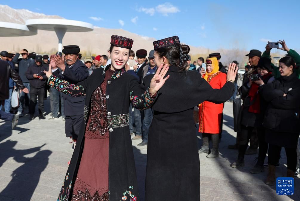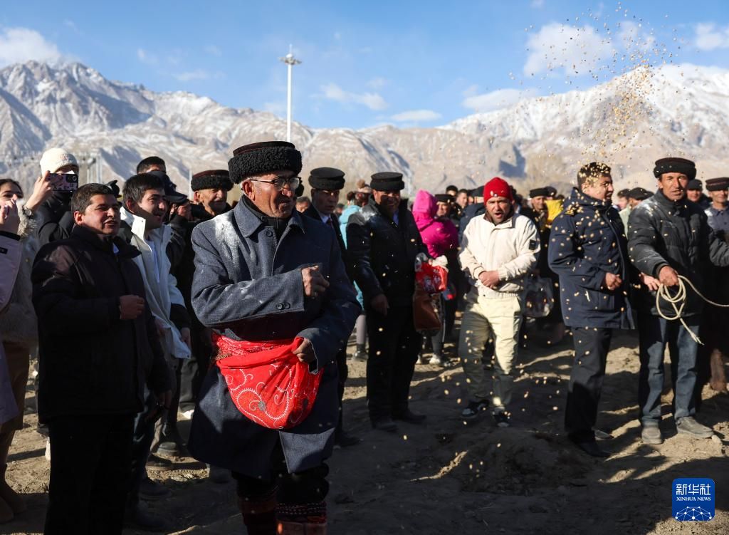 3月19日,新疆塔什库尔干塔吉克自治县居民在帕米尔高原上破冰引水、犁地播种、分享美食,与各地游客一起载歌载舞,庆祝传统农事节日,共同祝愿风调雨顺、民和年丰。 据悉,引水节和播种节源于当地民众生产生活,是中国国家级非物质文化遗产,日期不固定,通常在春分时节前后。图为人们跳舞庆祝。新华社