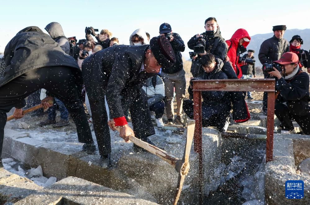 参与庆祝活动的村民在新疆塔什库尔干塔吉克自治县瓦尔希迭村田间渠道破冰引水。新华社