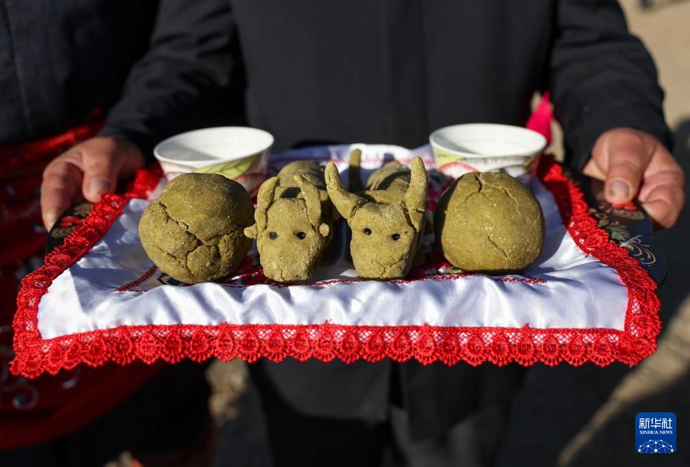村民端着由豌豆粉制作而成的耕牛形状面食和面团等。新华社
