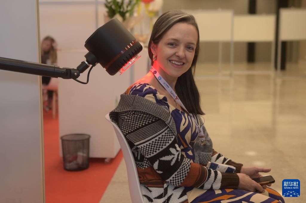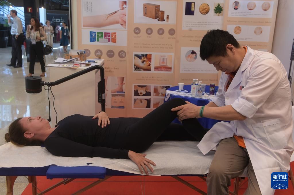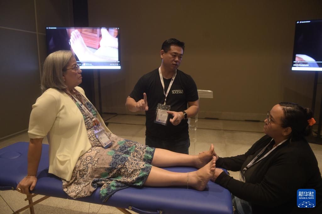 3月22日,在巴西首都巴西利亚举行的首届拉丁美洲中医药大会暨第二届巴西中医药国际大会上,一名中医(中)教授足部反射疗法。