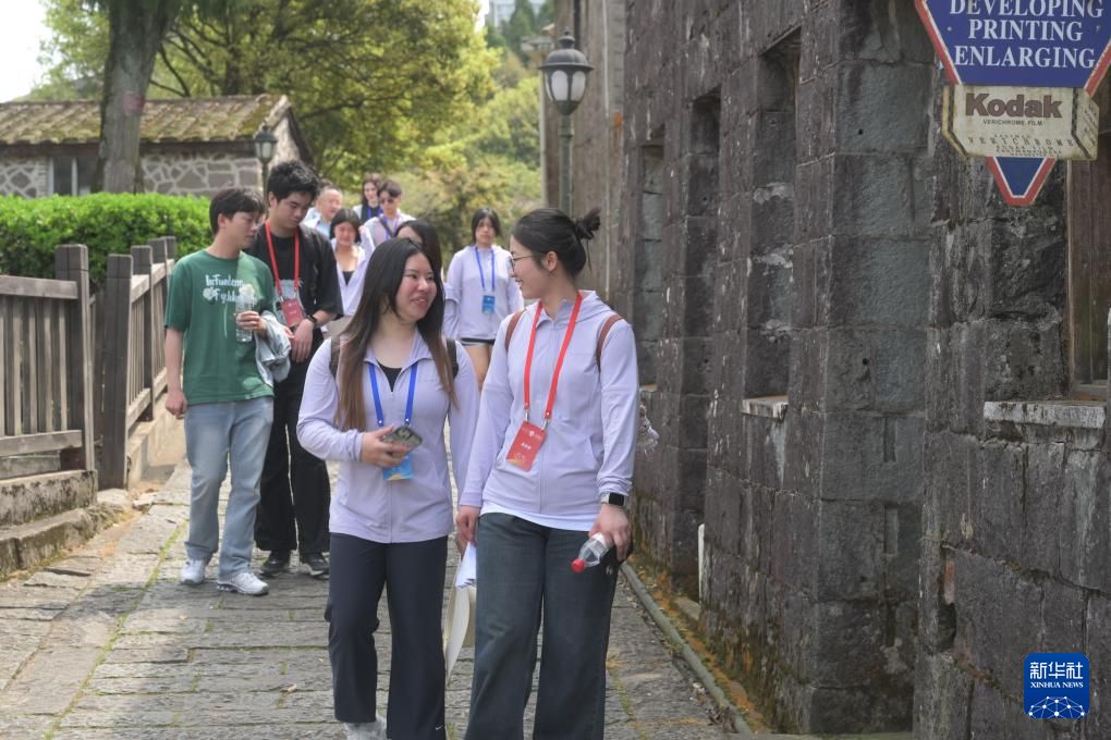 3月25日,福州大学外国语学院学生(前右)与美国太平洋大学学生(前左)在福州鼓岭老街漫步交流。新华社