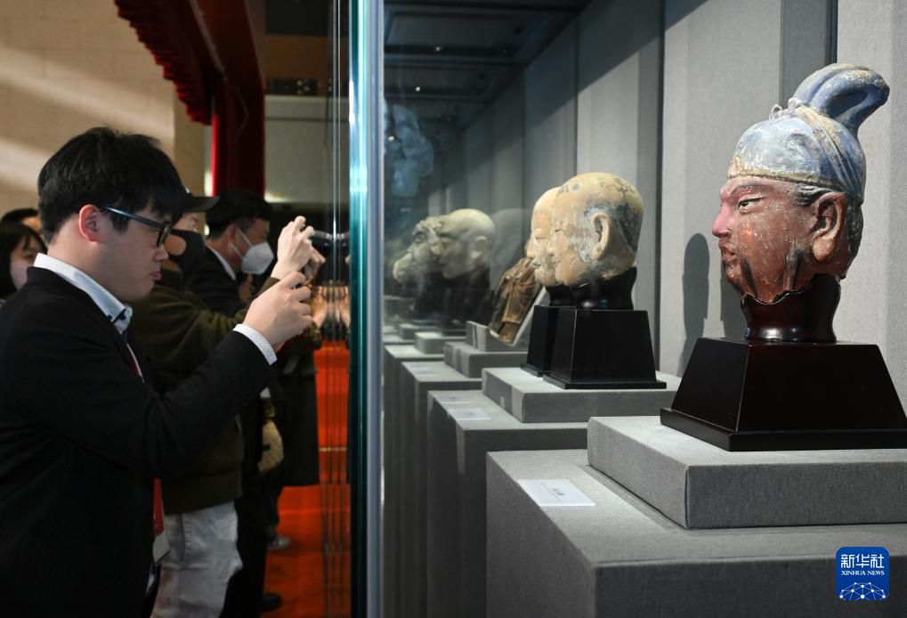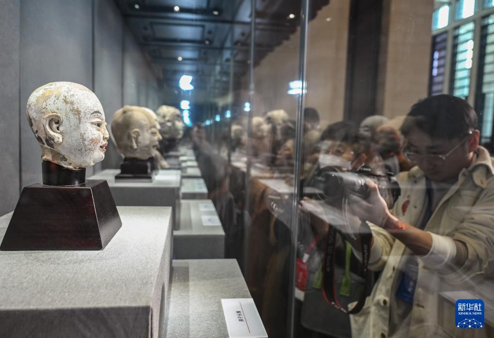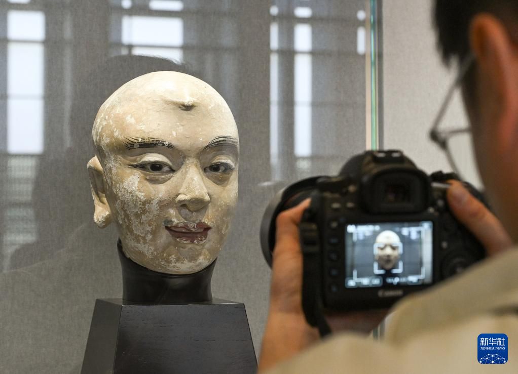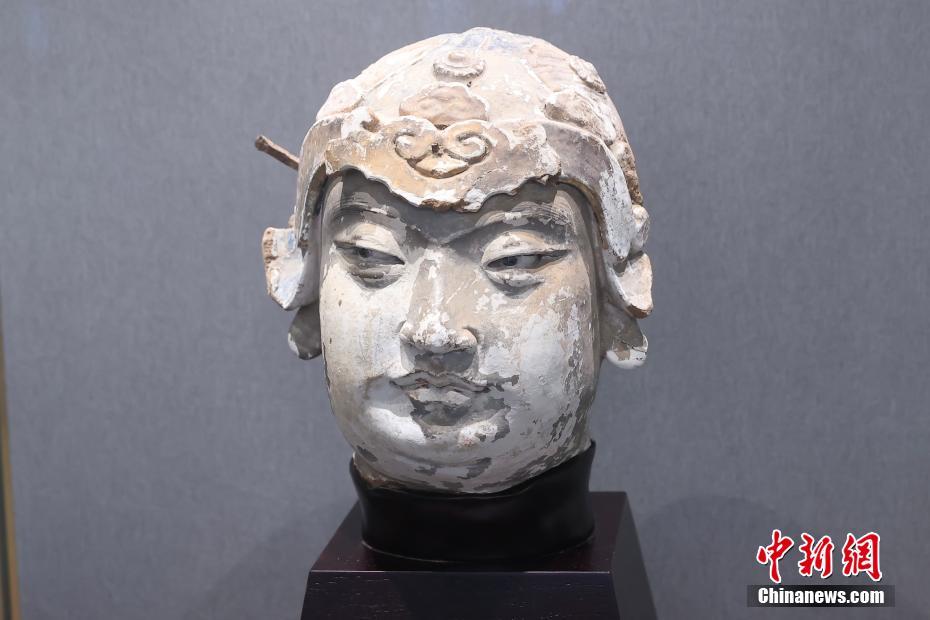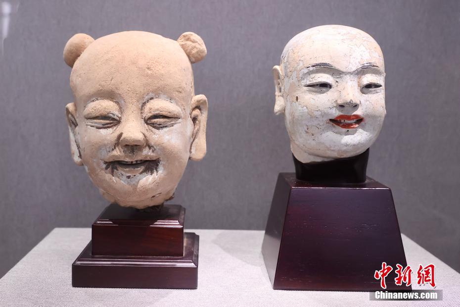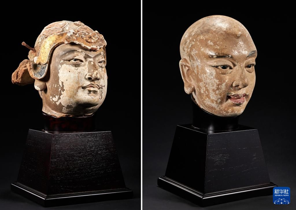 捐赠仪式上展出的童子头像(左)和弟子头像。中新网
