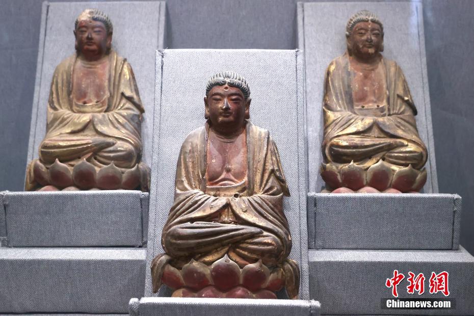 捐赠仪式上展出的三尊释迦摩尼佛坐像。中新网