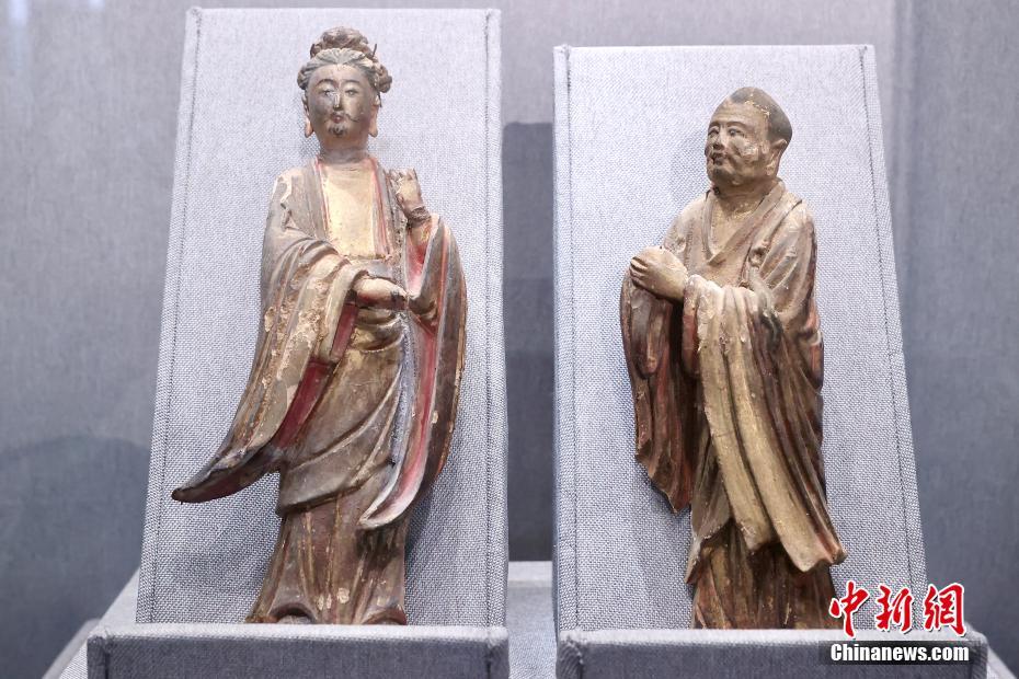 捐赠仪式上展出的菩萨立像(左)和佛弟子像。中新网