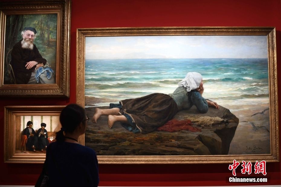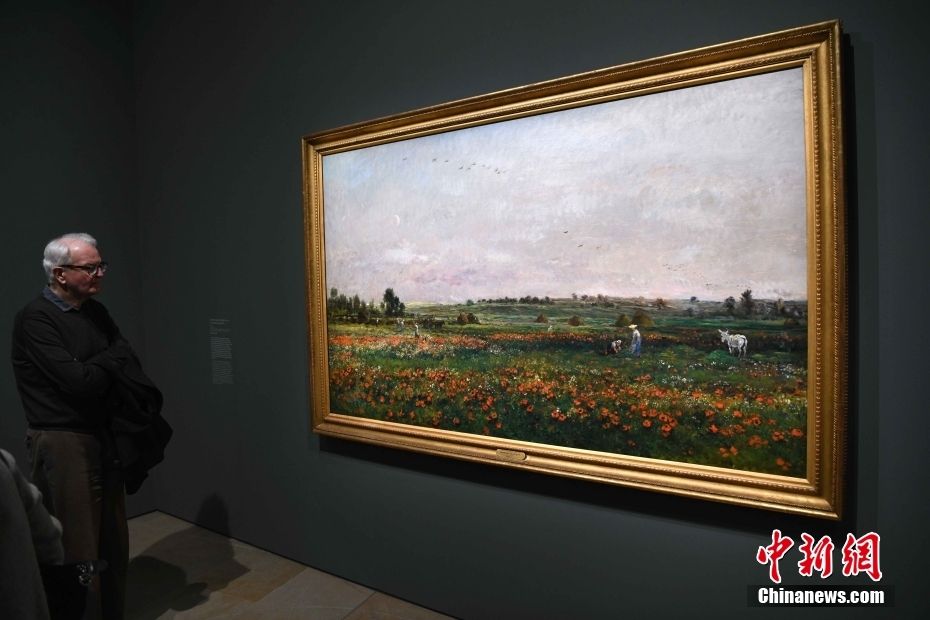 观展者在欣赏法国画家多比尼的作品《六月的田野》。