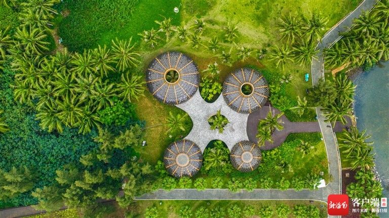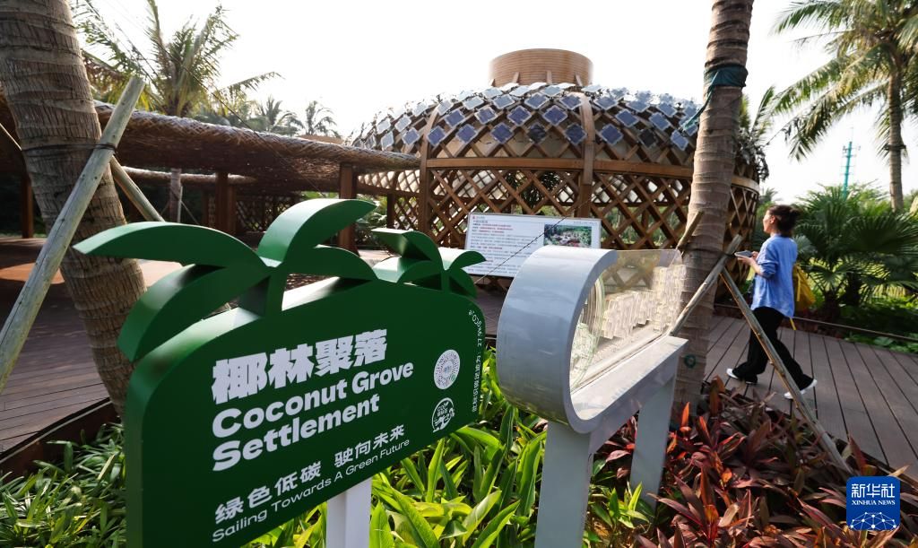 3月25日拍摄的博鳌近零碳示范区内的椰林聚落。椰林聚落是园林景观生态化改造的项目之一,应用高性能、环保的竹钢等材料作为骨架,建筑形态可以促进空气流通与降温,顶部覆盖1518块光伏板,收集转化太阳能供给园林照明,降低使用能耗与碳排放。新华社