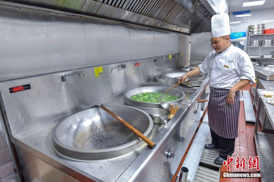 厨师在博鳌亚洲论坛大酒店厨房里使用电气化改造后的电气炉灶炒菜。中新网