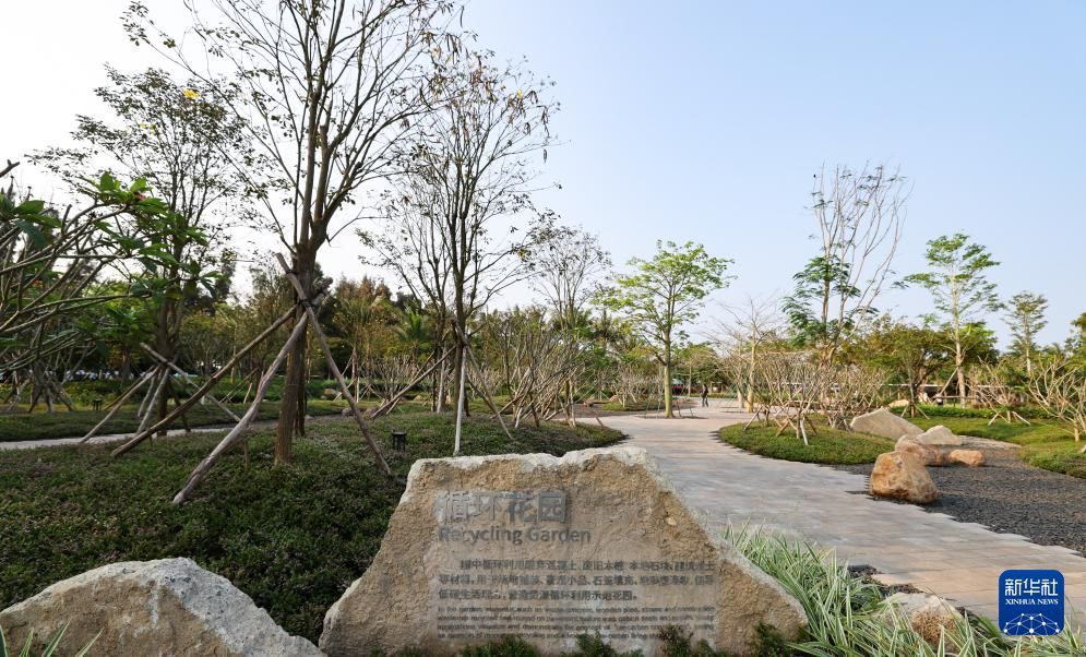 3月25日拍摄的博鳌近零碳示范区内的循环花园。循环花园是园林景观生态化改造的项目之一,将原来废弃场地利用改造,在建设中优先使用乡土材料和再生材料,并建设雨水花园,布设太阳能庭院灯和科普标识。新华社