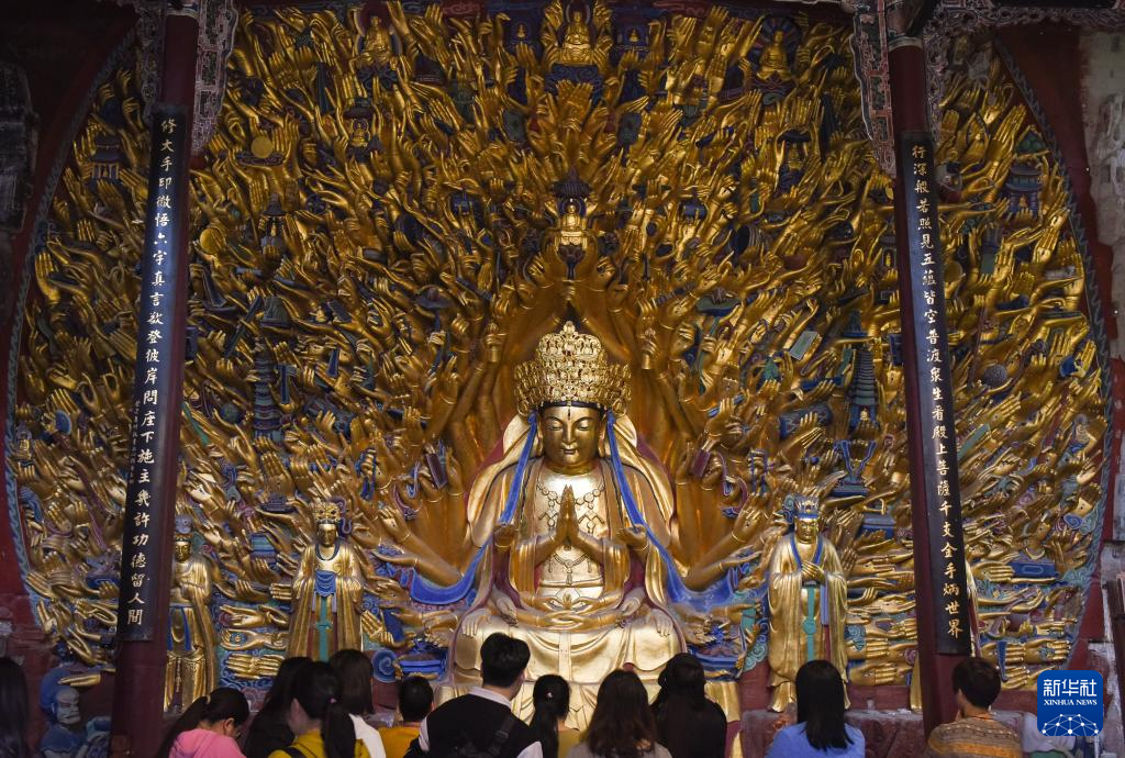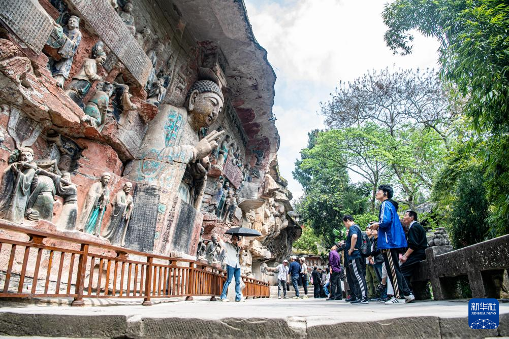 3月27日,游客在大足石刻景区参观。新华社