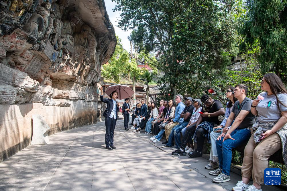 3月27日,导游向游客讲解大足石刻相关背景。新华社