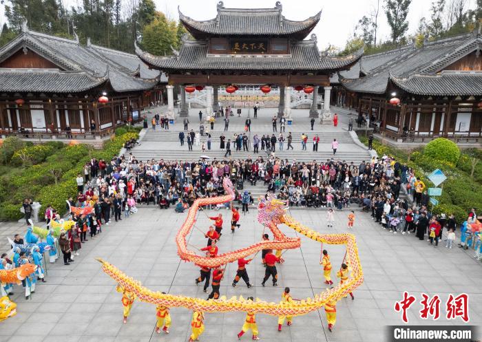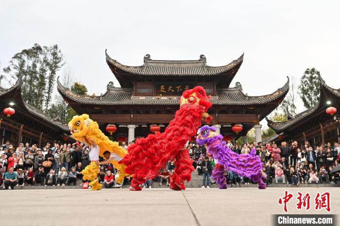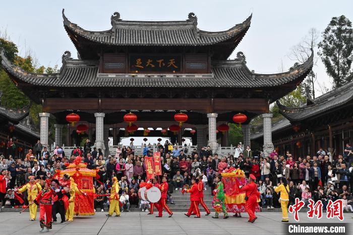 近日,位于中国重庆市的世界文化遗产大足石刻景区旅游热度持续攀升。据统计,2月份,大足石刻景区接待参观游客17.4万人,同比增长170.11%。3月26日至5月9日,2024大足石刻国际旅游文化节举行。本届旅游文化节将推出15项具有国际范、中国味、大足风的精彩活动,力争为广大游客呈现一场文化的盛宴、旅游的盛会、产业的盛典。3月27日,大足石刻国际旅游文化节期间,2024年宝顶架香庙会如期举行,吸引众多游客前往观光游玩。图为宝顶架香庙会的舞龙表演。中新网