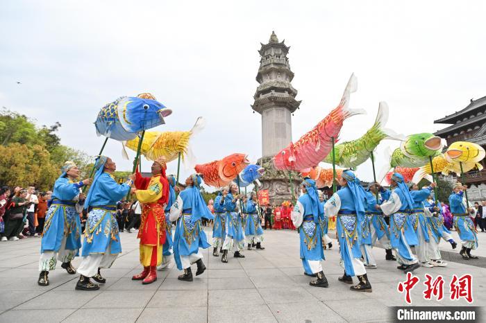 3月27日,在大足石刻国际旅游文化节宝顶香会民俗巡游展演环节,大足区70多名非遗传承人在大足石刻景区为游客们上演了一场场精彩绝伦的民俗展演。图为万古鲤鱼灯舞表演。中新网