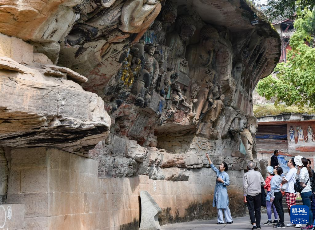 大足石刻位于重庆市大足区境内,始建于初唐,两宋达到鼎盛。1999年,大足石刻被列入世界遗产名录。图为3月27日,游客在大足石刻景区参观。新华社