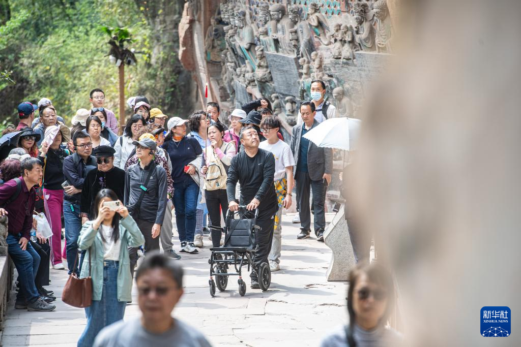 3月27日,众多游客在大足石刻景区参观。新华社