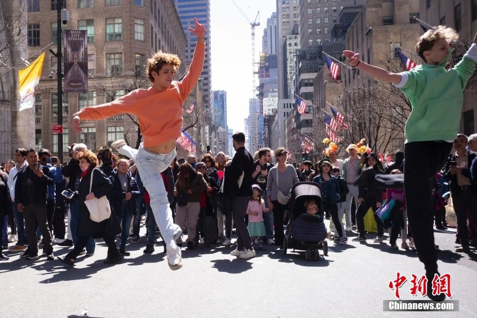 当地时间3月31日,纽约第五大道复活节花帽游行中的舞蹈表演。中新网
