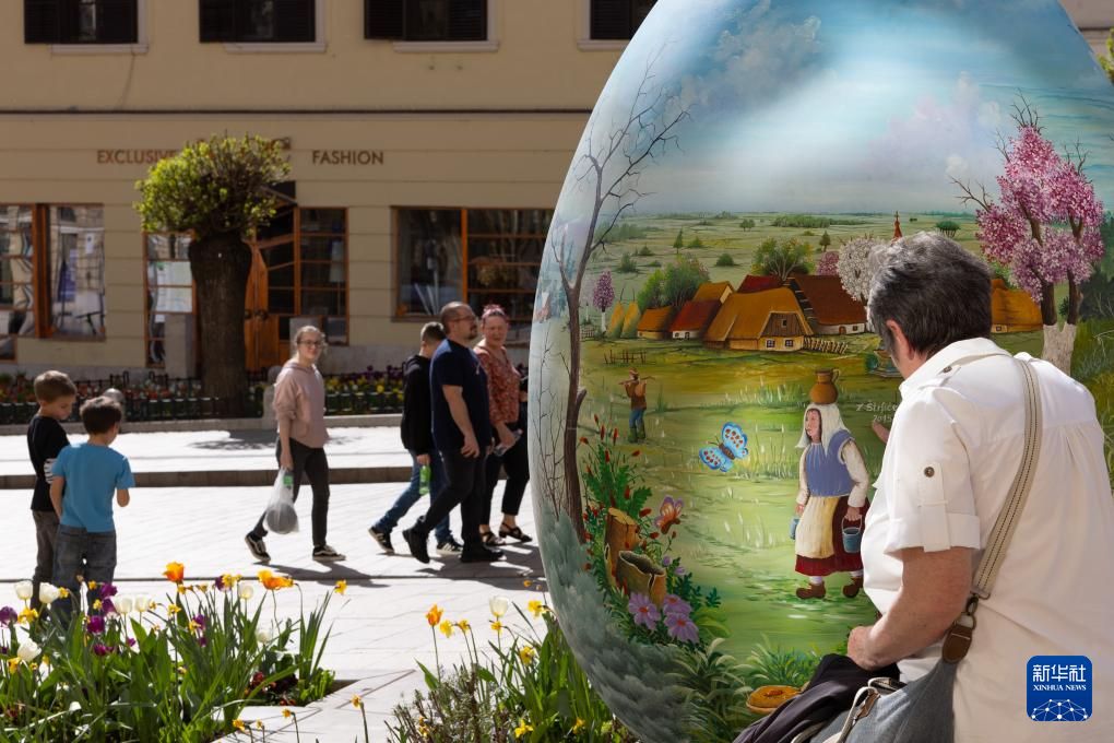 3月30日,人们参观佩奇街头的复活节巨型彩蛋。新华社