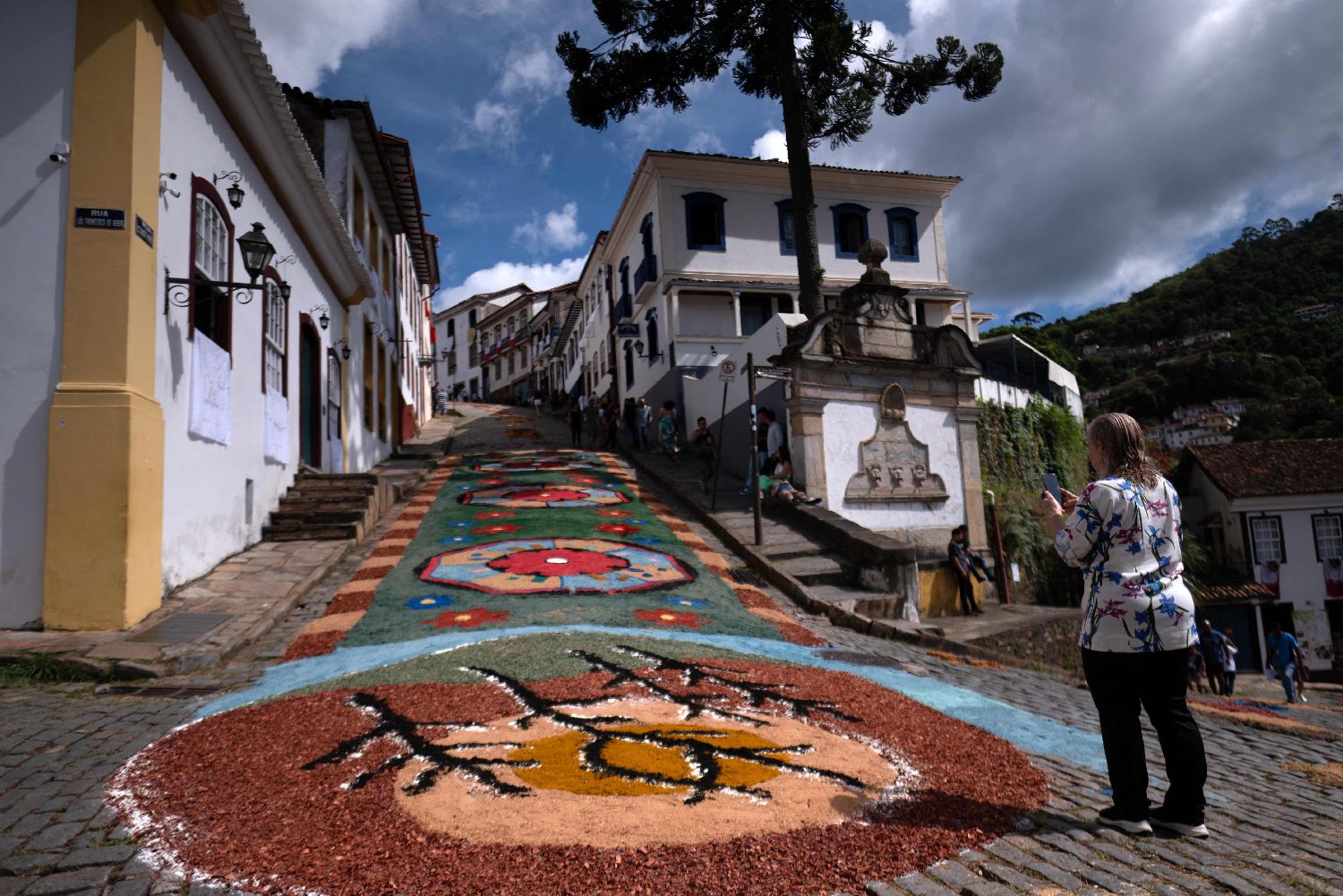 3月31日,在巴西米纳斯吉拉斯州,当地民众和游客用大约60吨彩色锯末“地毯”装饰街道,代表基督的复活。图为彩色锯末“地毯”吸引人们拍照。视觉中国
