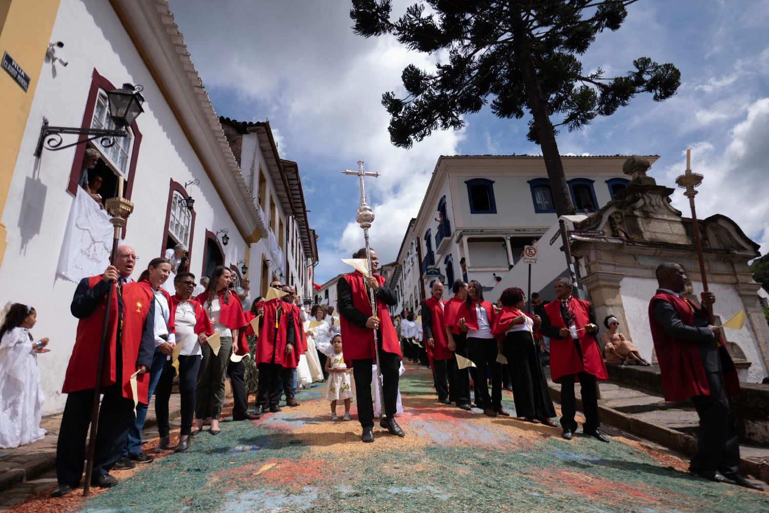 3月31日,巴西米纳斯吉拉斯州天主教信徒在复活节游行中走过锯末“地毯”。视觉中国