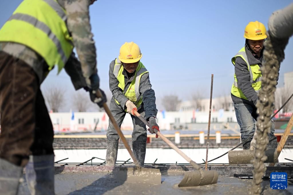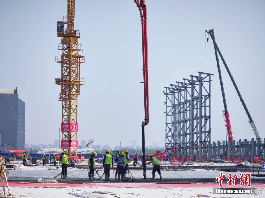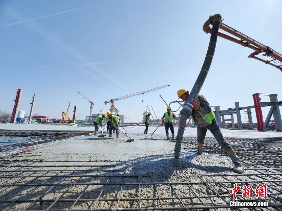 3月31日,工人在空客天津第二条总装线项目建设现场进行浇筑作业。中新网