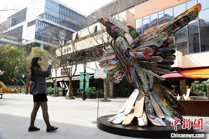 由199块废弃滑板组成的作品——《天地鸣响》吸引路人驻足欣赏。