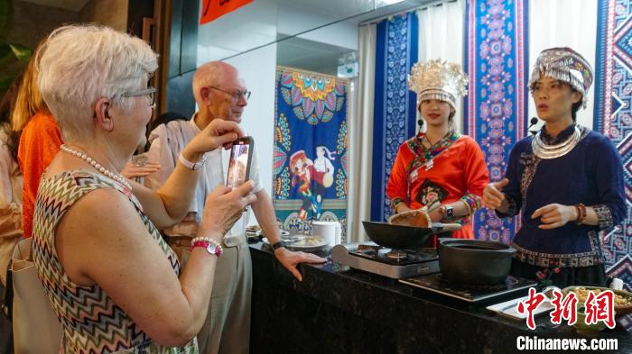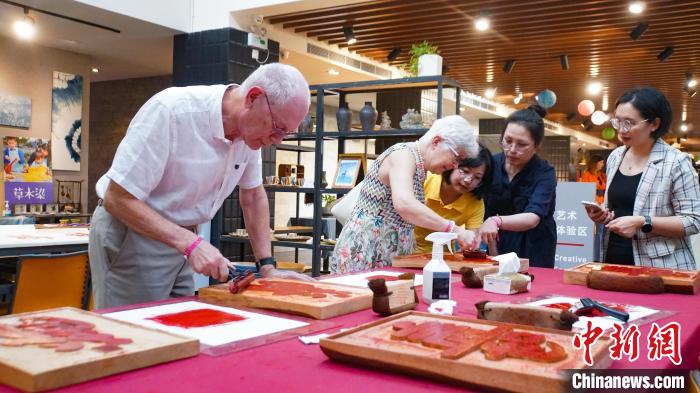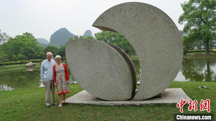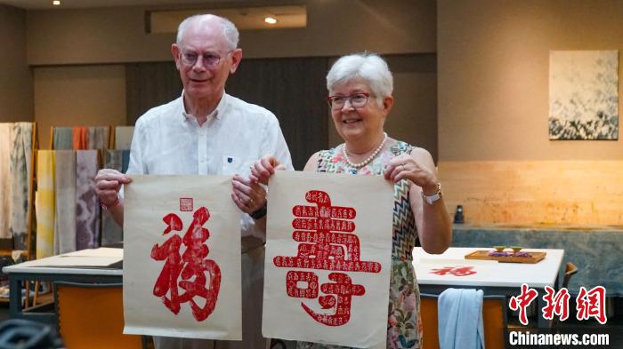 4月1日,欧洲理事会荣誉主席、比利时前首相赫尔曼·范龙佩先生(Herman Van Rompuy)携夫人到访广西桂林市愚自乐园,缅怀故友雕塑家希尔德·凡·苏梅尔(Hilde Van Sumere),在欣赏故友的雕塑作品《莲》中了解到朋友25年前参与项目的筹建工作故事,近距离感受自然与艺术结合的魅力,并通过体验恭城油茶、拓印百寿图的非遗活动,感受当地少数民族文化。图为范龙佩夫妇展示拓印成果。