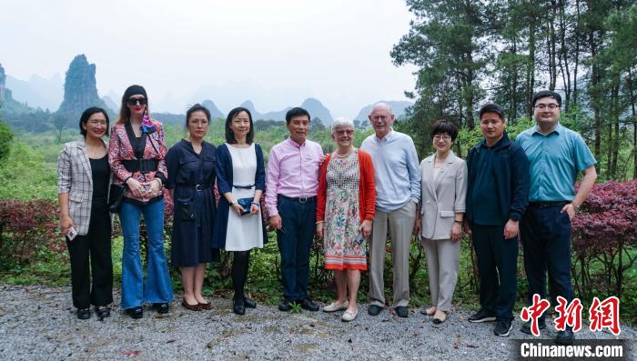 据了解,由台湾企业家曹日章创办的桂林愚自乐园,从1997年至今共组织了十一届国际雕塑创作营、八届国际绘画创作营,号召来自世界各地的百余名艺术家驻地创作,在园区内留存200多件珍贵的艺术品。图为嘉宾们合影留念。