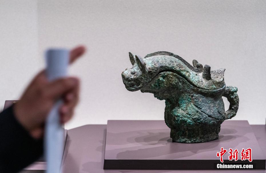 本次展览展出河南博物院及省内10多家文博机构超过150件(套)文物,其中33件(套)属中国一级文物,有约40件(套)是首次离开河南省展出。图为安阳殷墟妇好墓出土的“妇好”圈足觥。中新网