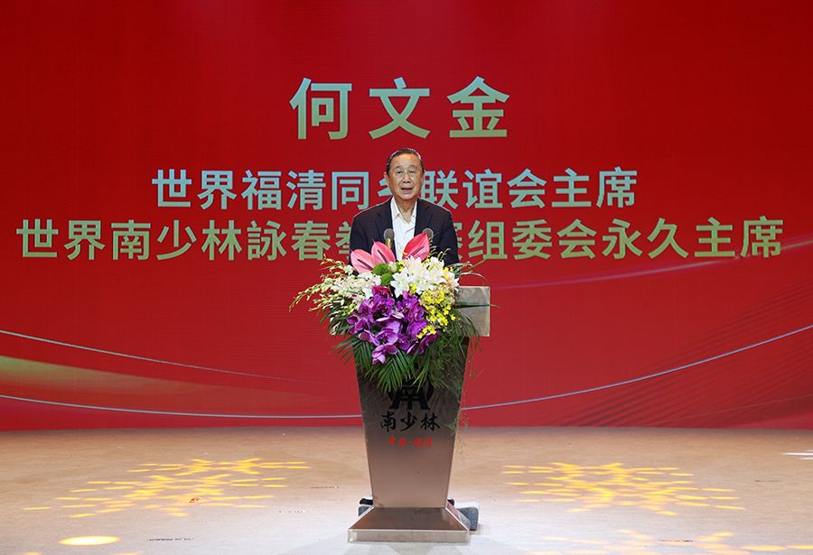 世界福清同乡联谊会主席、世界南少林咏春拳大赛组委会永久主席何文金致辞。人民网/主办方供图