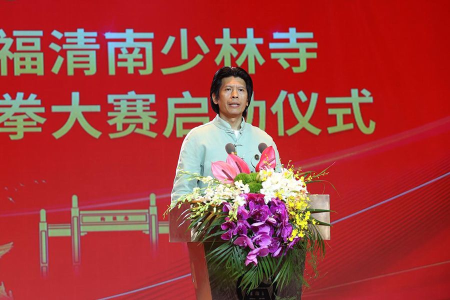 中国国家级非物质文化遗产保护项目咏春拳代表性传承人、福建省咏春拳协会会长郑祖杰在首届世界南少林咏春拳大赛启动仪式上发言。人民网/主办方供图