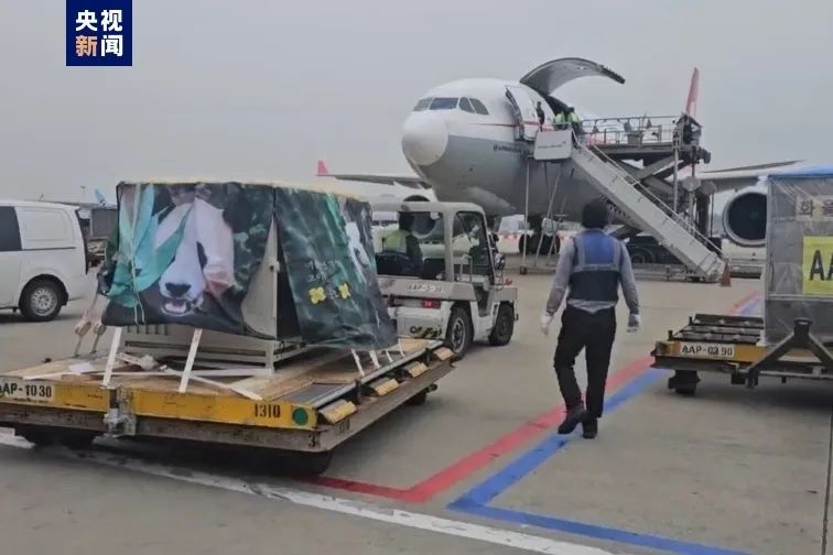“福宝”在韩国仁川国际机场登机。大陆央视新闻客户端
