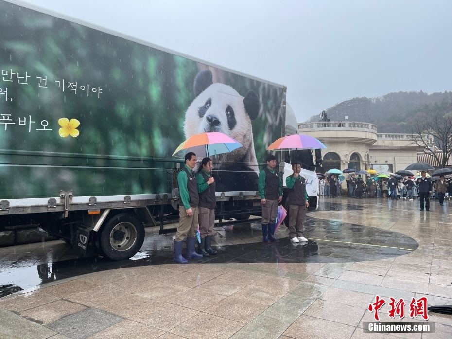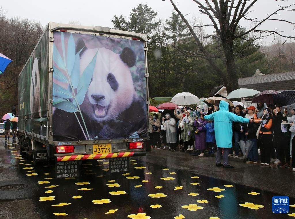 4月3日,人们在韩国京畿道龙仁市的爱宝乐园雨中送别大熊猫“福宝”。新华社