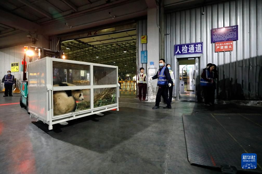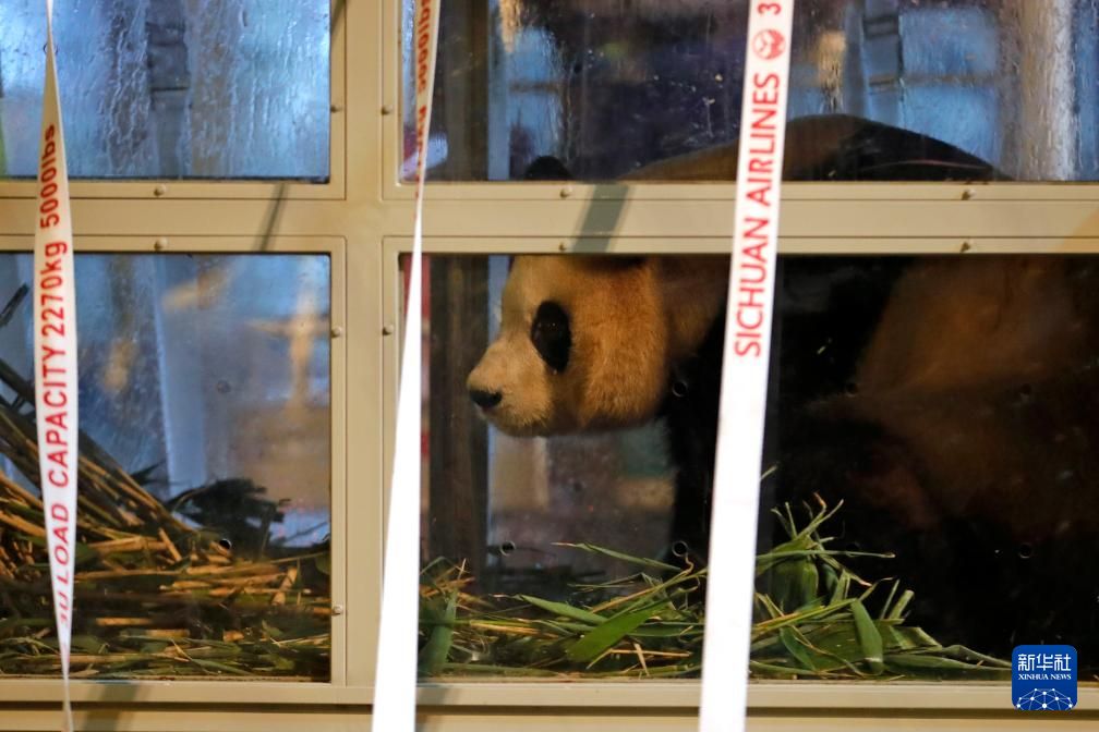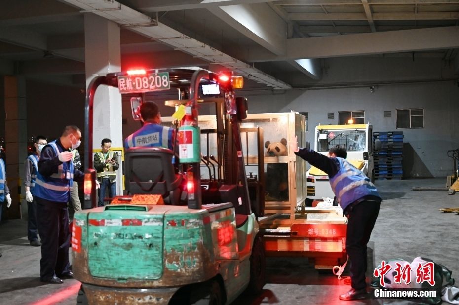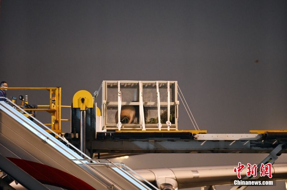 4月3日晚,旅韩大熊猫“福宝”搭乘包机抵达成都双流国际机场。新华社