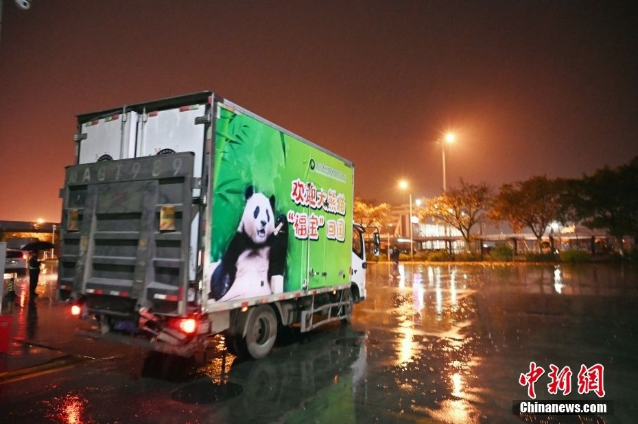 搭载大熊猫“福宝”的转运车驶离机场。中新网