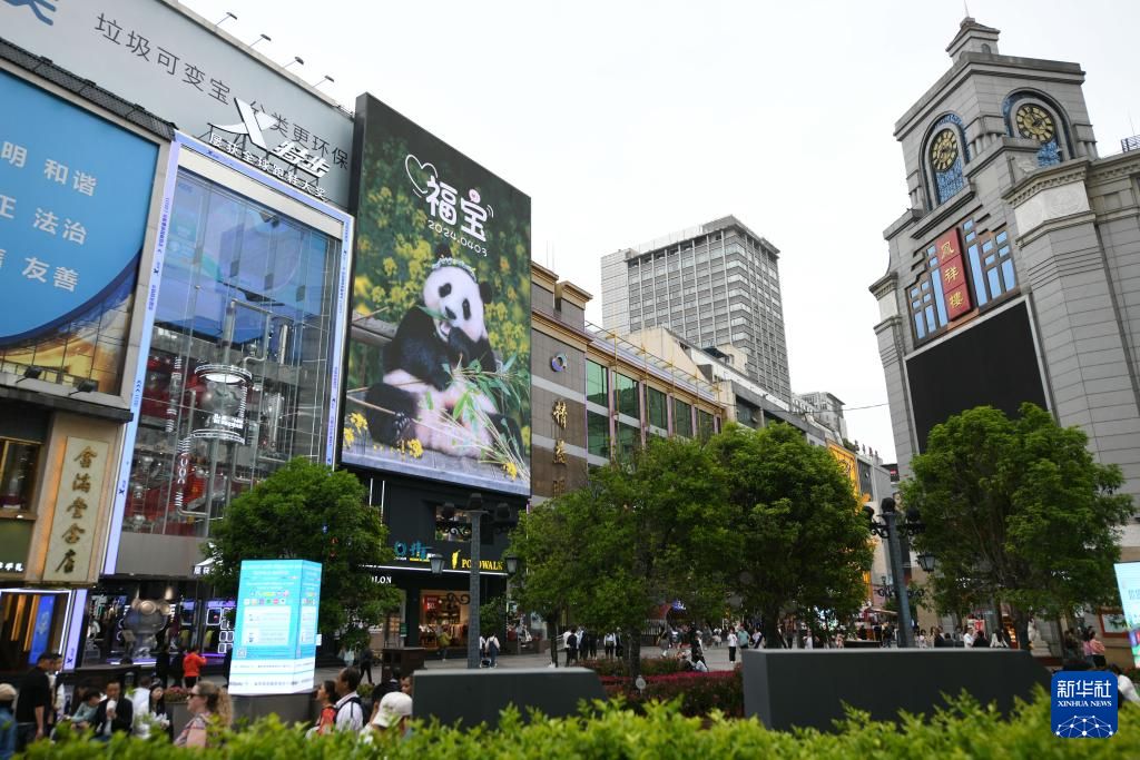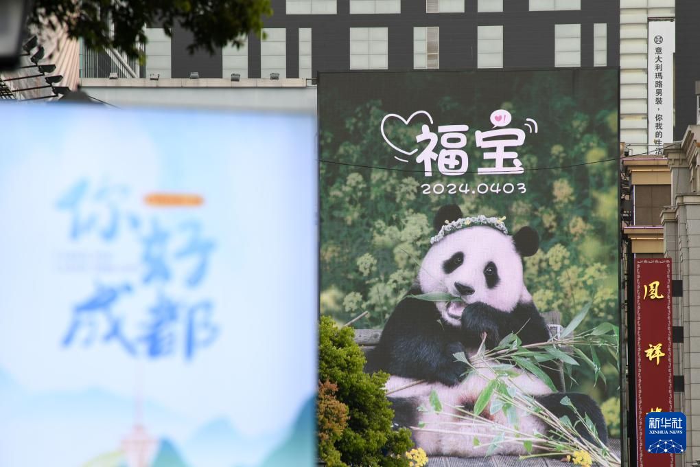 4月3日,在成都春熙路步行街上拍摄的大熊猫“福宝”应援屏幕。新华社