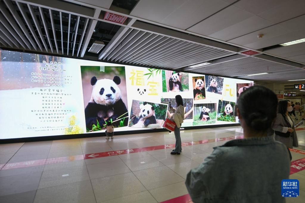 4月3日,市民在成都春熙路地铁站内拍摄大熊猫“福宝”应援灯箱。新华社