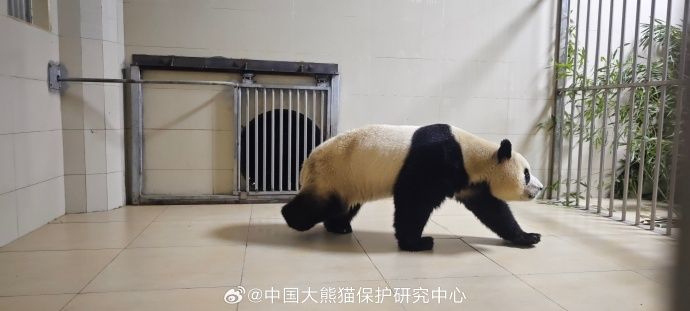 大熊猫“福宝”在中国大熊猫保护研究中心卧龙神树坪基地隔离检疫圈舍巡视。中国大熊猫保护研究中心官方微博