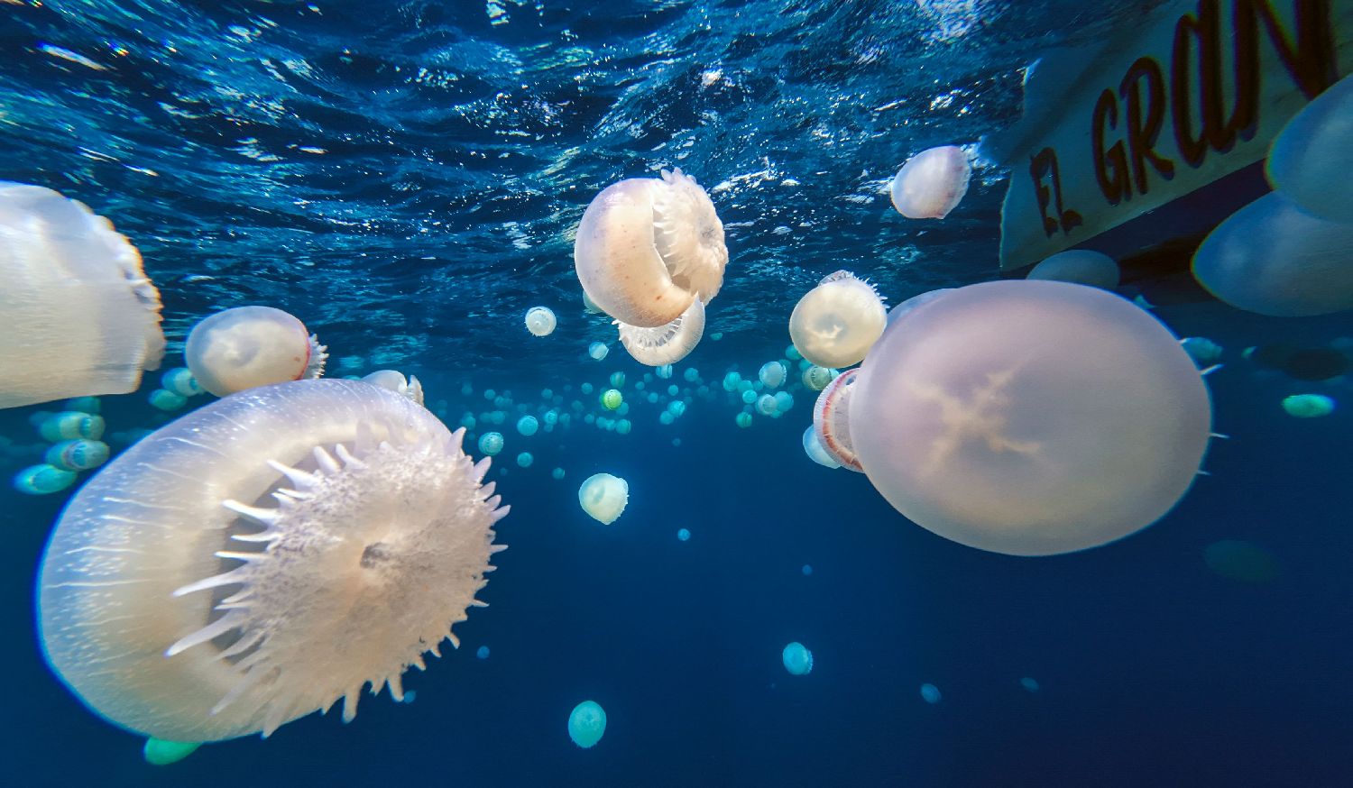 近日,委内瑞拉阿拉瓜州数百只炮弹水母漂浮在碧绿的海水中,呈现超现实场景。图为阿拉瓜州Chuao海岸的炮弹水母(沙海蜇)。