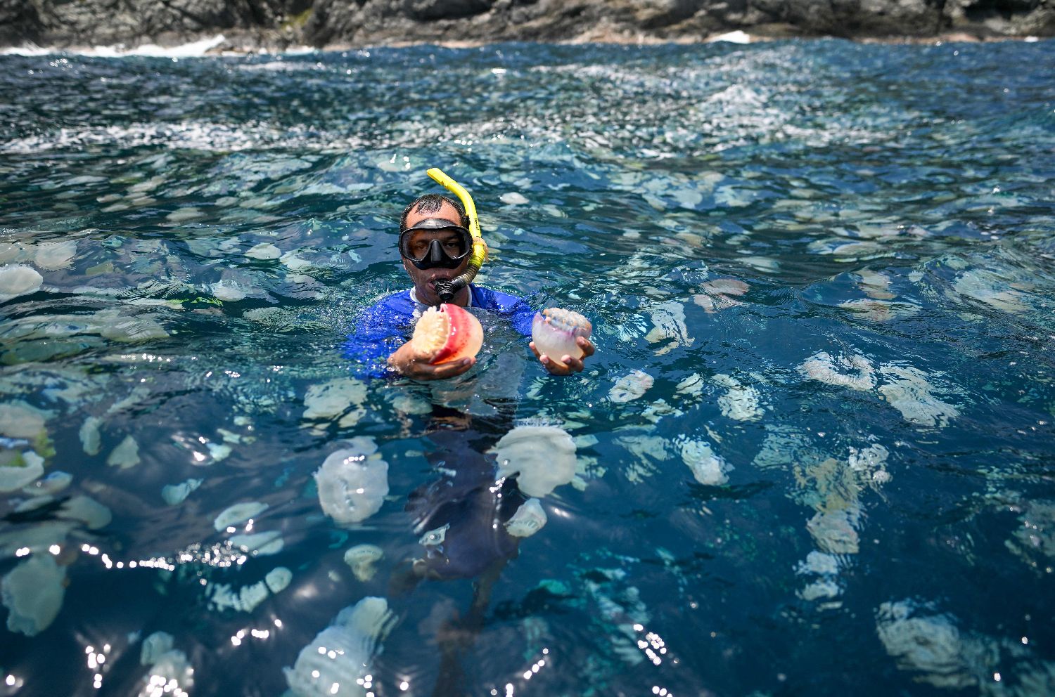 4月5日,委内瑞拉中央大学动物与热带生态研究所的教授兼研究员Joxmer Scott Frias在Chuao海岸展示一种炮弹水母(沙海蜇)。