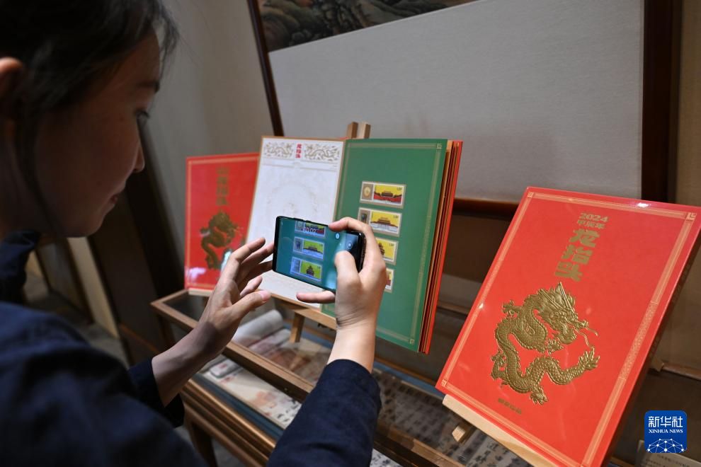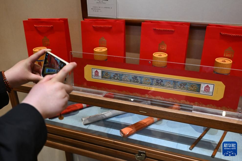 4月7日,“‘宫’邮万里 四季安康——甲辰系列主题邮品”发布会在北京故宫博物院举行。此次故宫邮局推出《四季故宫》藏书票、《甲辰太和》《九龙壁》个性化邮票、《龙抬头》《龙腾紫禁》邮册等多款甲辰系列主题邮品,在邮票方寸世界中呈现故宫四时美景与院藏珍宝。图为4月7日,记者在发布会上拍摄《九龙壁》个性化邮票。新华社