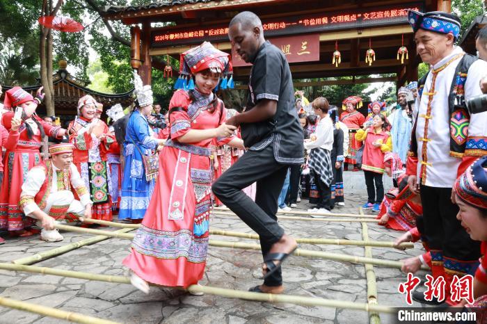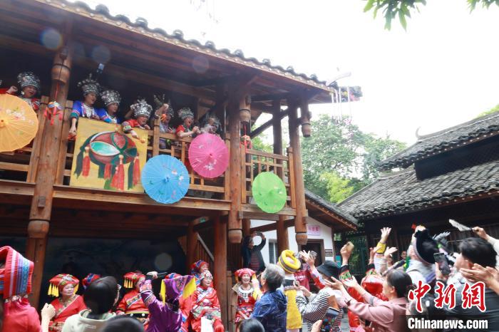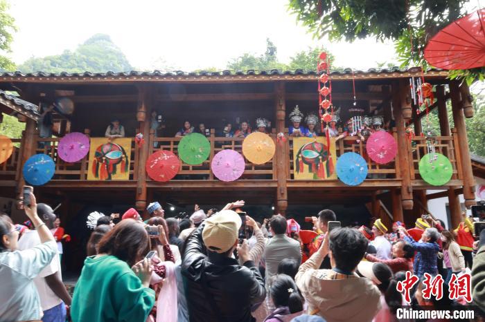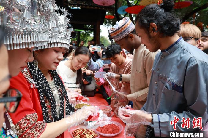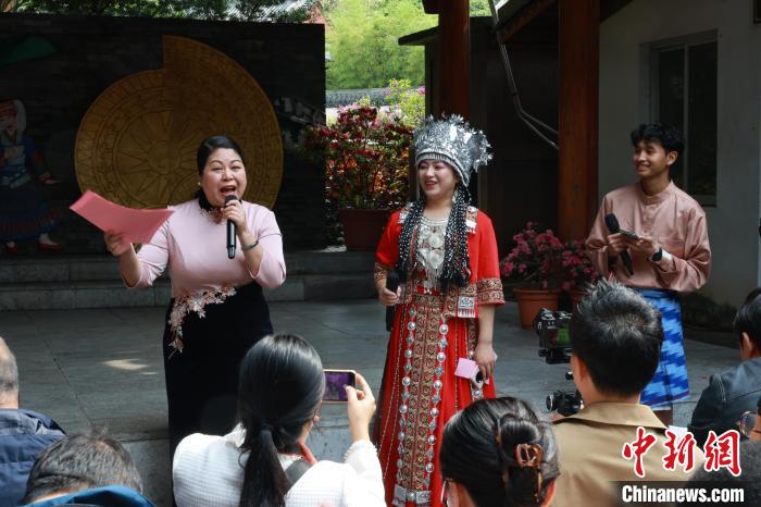 4月8日,中国的山歌爱好者与来自海外的留学生齐聚广西柳州市鱼峰公园对歌,通过歌舞互动,增进中外文化交流。此外,来自柳州职业技术学院的近30名留学生还一同体验抛绣球、跳竹竿舞等传统民俗文化,提前感受广西“三月三”的多姿多彩。图为4月8日,“网红”山歌手山三妹团队抛绣球引起民众围观。
