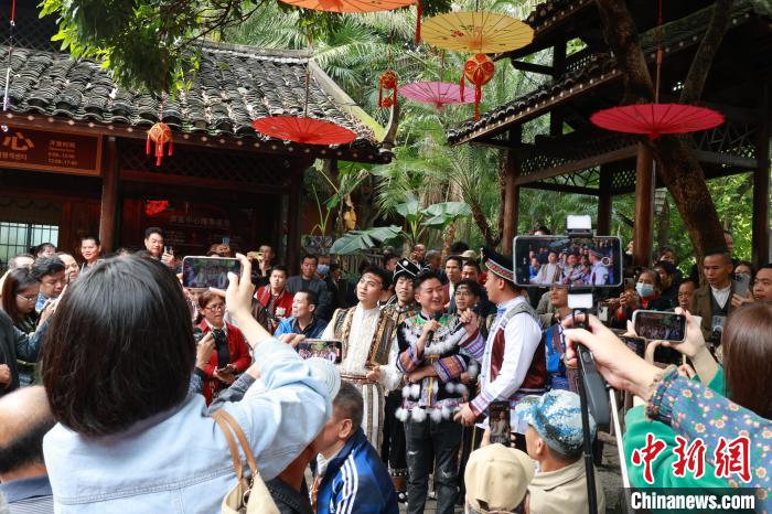 4月8日,“网红”山歌手山三妹团队唱山歌吸引民众围观。