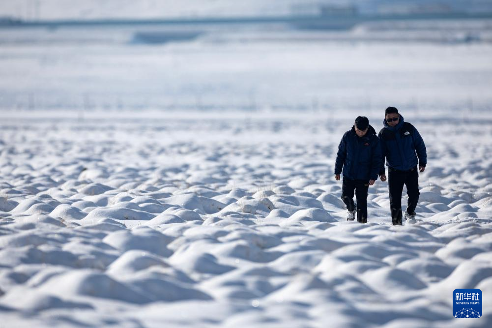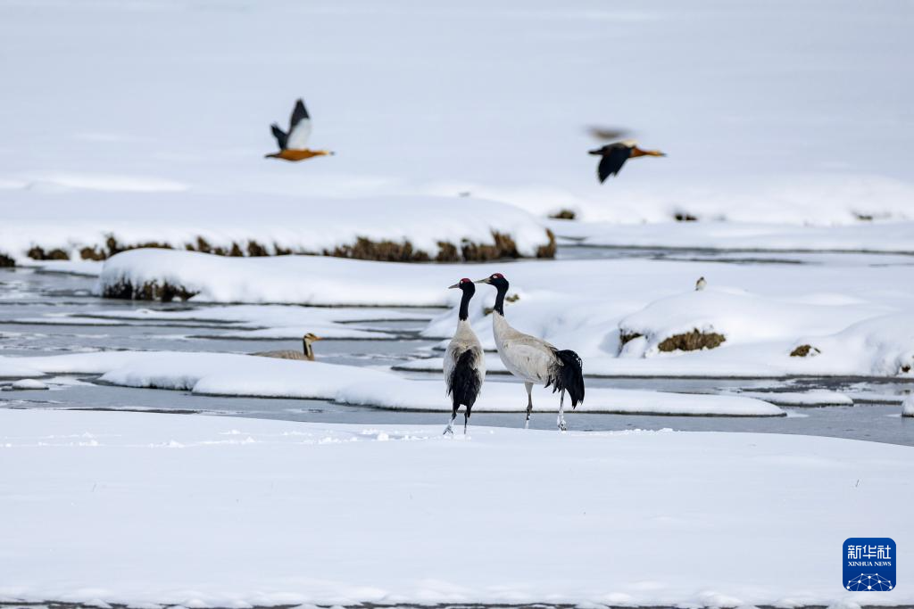 黑颈鹤被称为“雪域高原的精灵”。每年春季,北返的黑颈鹤会在西藏当雄县城附近的阿热湿地休息、觅食,为接下来的旅程储备能量。每当这时,就是当雄县野生动物疫源疫病监测员尼玛顿珠和同事们最忙的时候。为了确保鸟类安全迁徙,他们需要在海拔4000多米的湿地徒步巡护。尼玛顿珠在此守护黑颈鹤已经15年,救护了多只受伤的黑颈鹤,让它们重返蓝天自由飞翔。图为尼玛顿珠(右)和同事扎西顿珠在雪后的阿热湿地徒步巡护(4月7日摄)。新华社