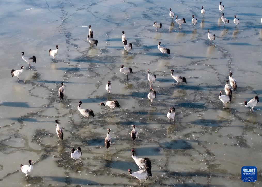 在阿热湿地拍摄到的迁徙途中的黑颈鹤。新华社