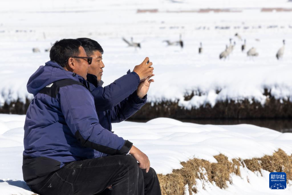 尼玛顿珠(左)和同事扎西顿珠在雪后的阿热湿地观察迁徙途中的黑颈鹤(4月7日摄)。新华社