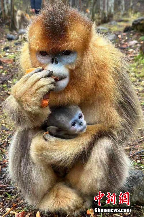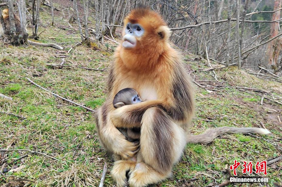 神农架川金丝猴是中国金丝猴地理分布的最东端,也是川金丝猴湖北亚种的全球仅存分布地,与其他分布区呈隔离状态。湖北神农架国家公园大龙潭金丝猴野外研究基地近日传来喜讯,近一个月来,该基地已出生6只健康的金丝猴宝宝。图为金丝猴妈妈抱着刚出生的宝宝。中新网