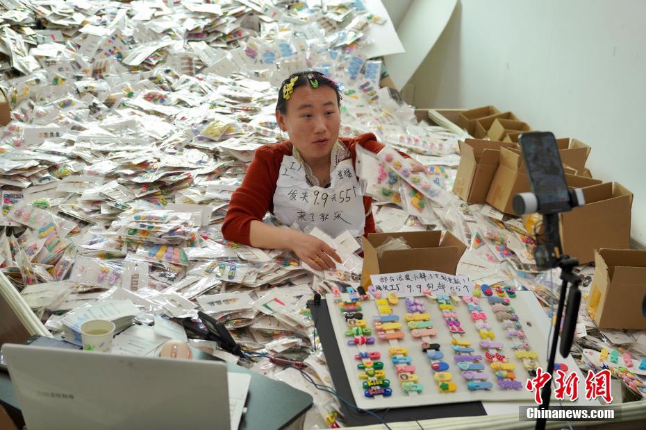 4月11日,一名主播坐在发夹堆里,对着镜头讲解产品。